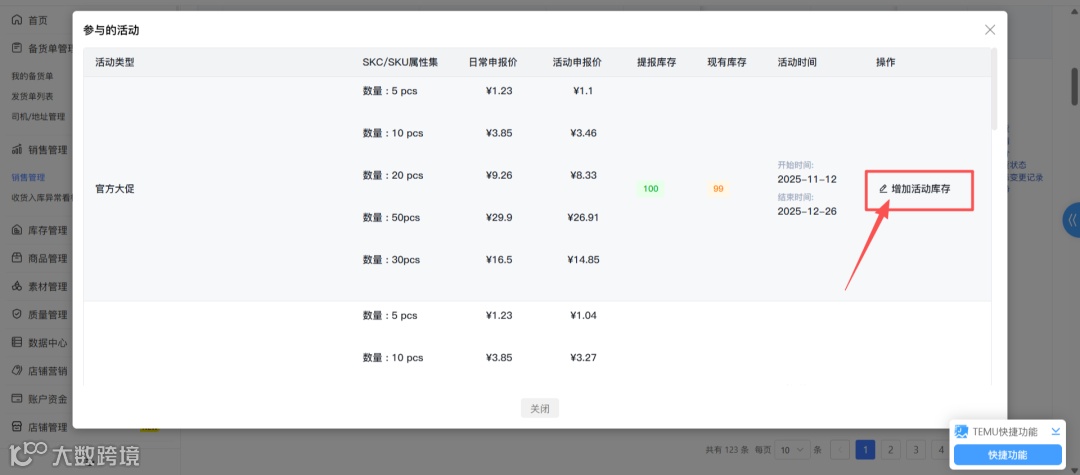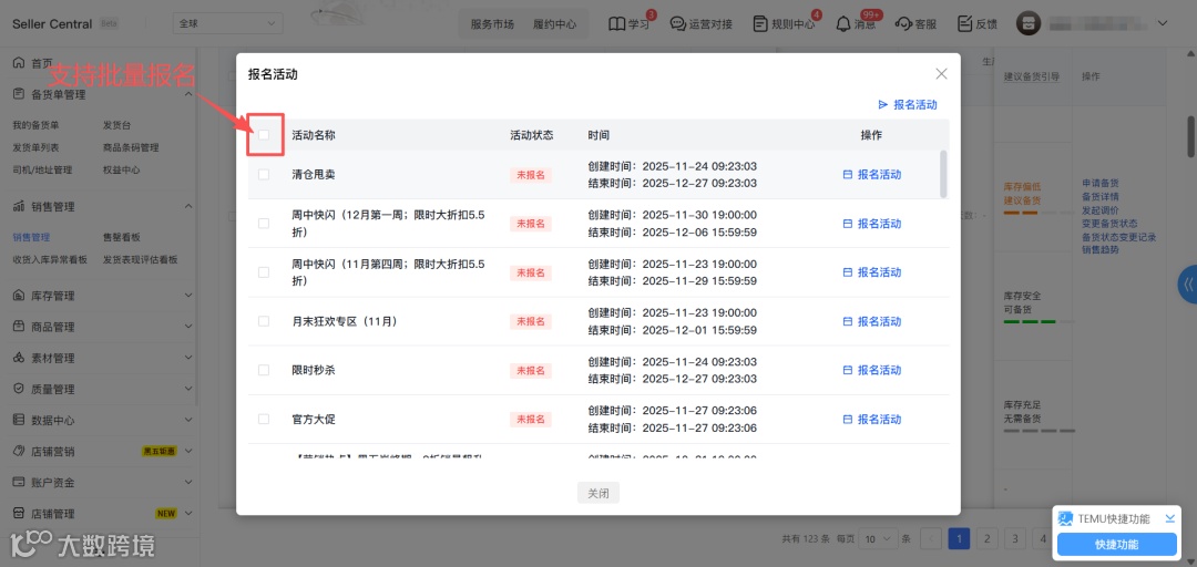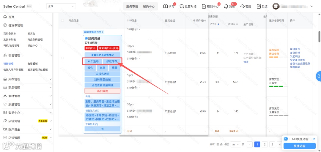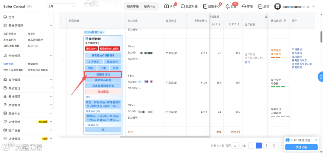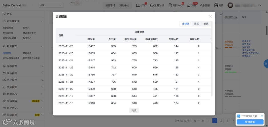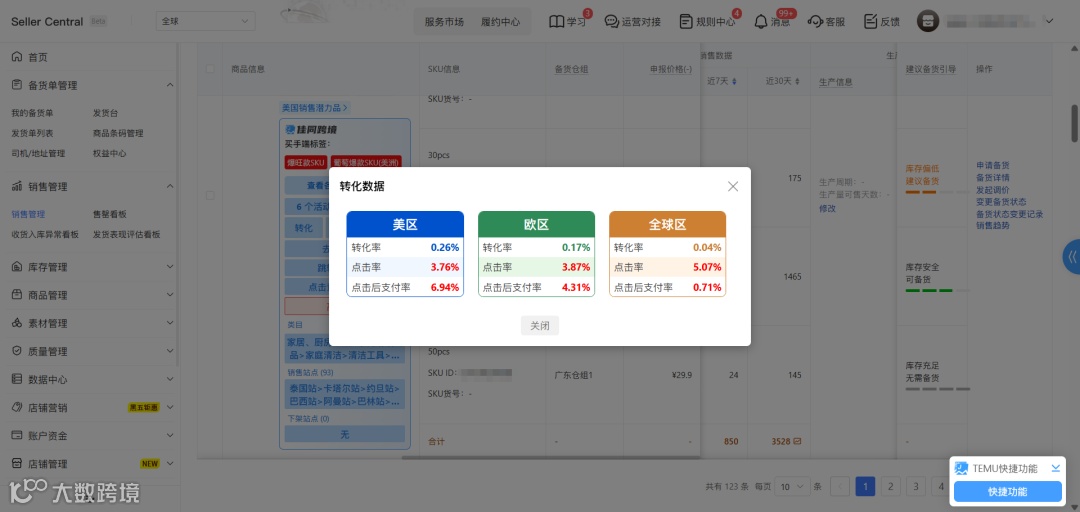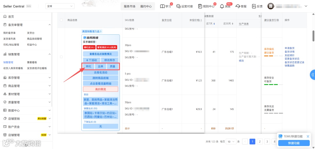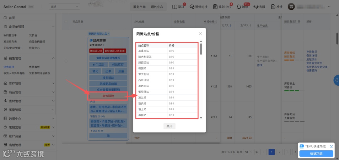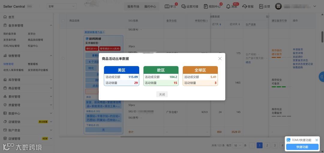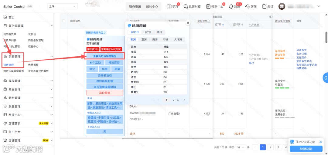 1、进入TEMU销售管理页面,点击功能按钮,即可查看各站点的销售情况
