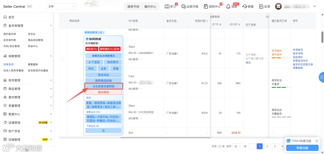 支持查看商品的多项信息(站点异常,限流,违规需求,流量,报活动等等)