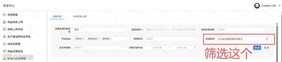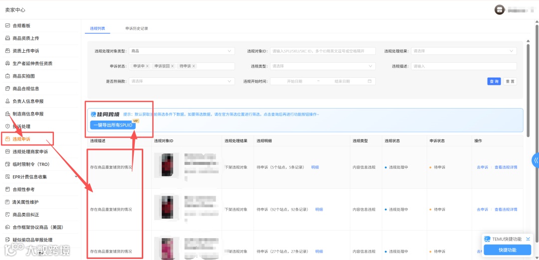 1、进入违规申诉页面,筛选出存在商品重复铺货的情况的商品,点击一键导出