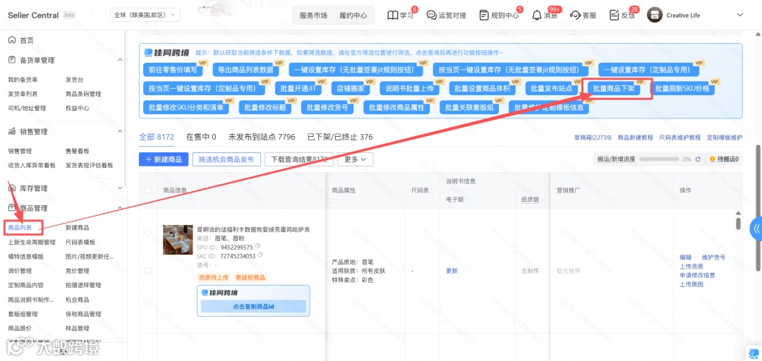 2、到商品列表或上新生命周期页面,单击批量下架按钮