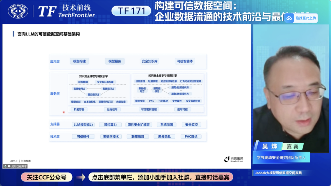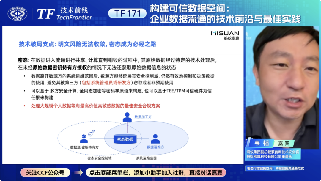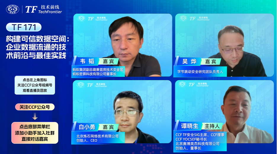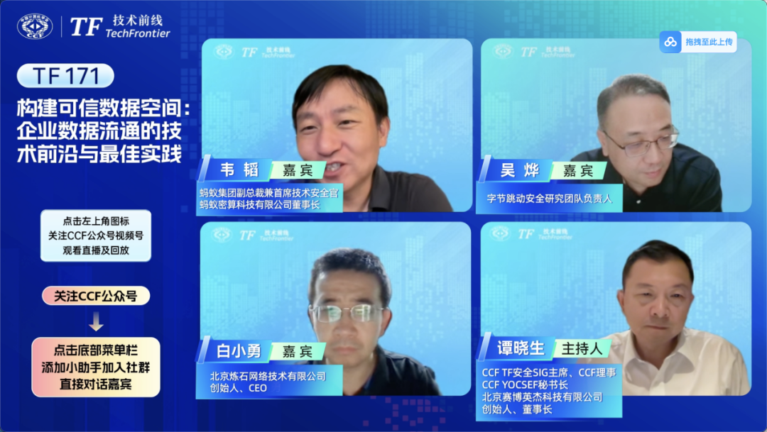2025年9月16日,CCF TF第171期活动如期举行,主题为“构建可信数据空间:企业数据流通的技术前沿与最佳实践”。本次活动由CCF TF安全SIG策划呈现,邀请到蚂蚁集团副总裁、蚂蚁密算董事长韦韬、字节跳动安全研究团队负责人吴烨、炼石网络创始人&CEO白小勇三位讲者,分别从产业-技术-实践角度带来了侧重点不同的分享。活动以线上直播的形式进行,吸引了众多专业人士的参与。本文将系统梳理本次活动的核心观点与技术洞察,呈现可信数据空间的最新发展趋势。