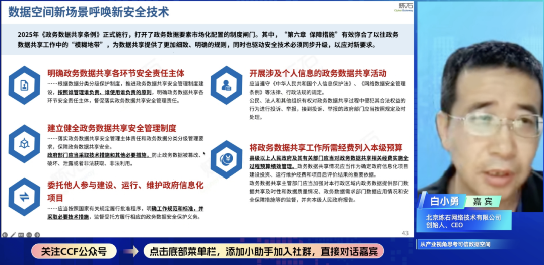 北京炼石网络技术有限公司创始人、CEO白小勇以《从产业视角思考可信数据空间》为题,分享了可信数据空间的定义、产业位置、挑战与机遇,及其与网络安全的融合与促进。