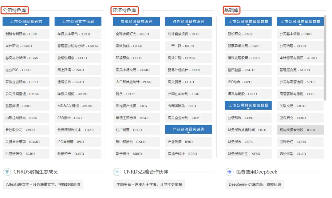 CNRDS特色数据库紧跟学术热点和学术前沿,提供市场尚无或者获取难度较大的前沿研究数据;CNRDS基础数据库参阅各领域重点文献,整合了学术研究过程中可能用到的大部分基础数据。