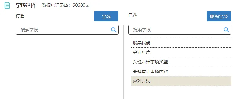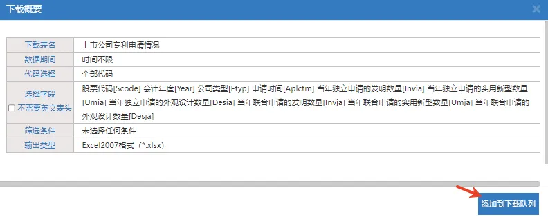 3.字段选择:勾选需导出的字段(如“申请时间”“发明数量”),支持全选或关键词搜索。