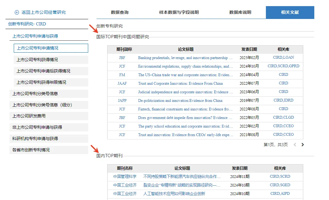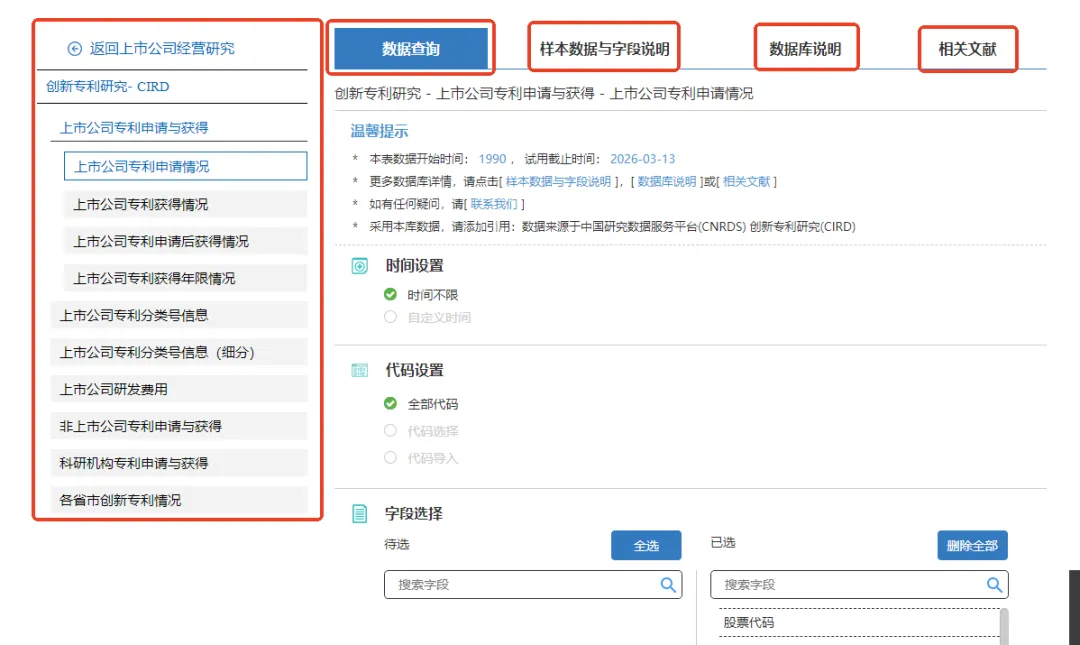 导航至“数据库-模块-表格”层级(如CIRD→上市公司专利申请与获得→专利申请情况)。