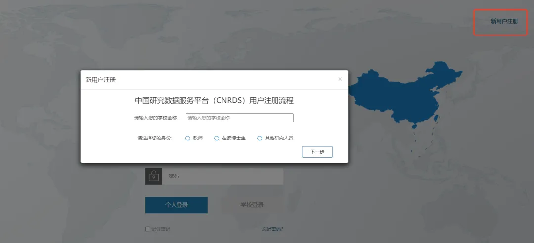 2.特色库数据获取:注册个人账号,选择“个人登录”(同时可获取基础库数据)。