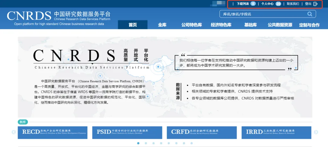 中国研究数据服务平台(Chinese Research Data Services,CNRDS)是一个高质量、开放式平台化的中国经济、金融与商学研究的综合数据平台。