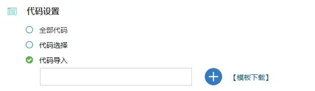 “代码导入”:上传按模板整理的代码文件(Excel/CSV)。