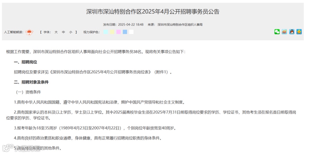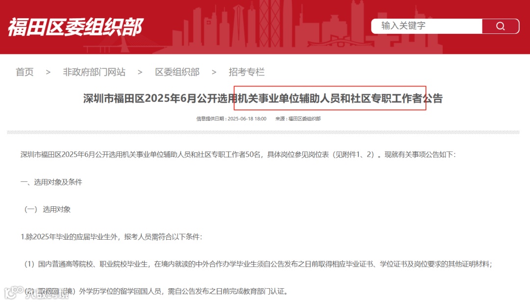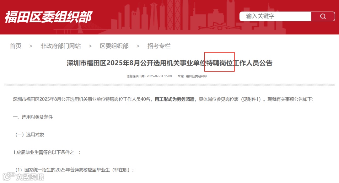 福田、宝安、罗湖经常会出现事业单位特聘岗位公告,就前段时间发布的《深圳市福田区2025年8月公开选用机关事业单位特聘岗位工作人员公告》来说,学历要求基本为研究生,并且需要从事岗位相关工作2~5年以上,是重要骨干或某个相关项目的主导负责人。