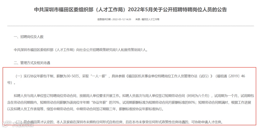 1、实行协议年薪包干制,薪酬为30-50万,采取“一人一薪”,具体参照《福田区机关事业单位特聘岗位工作人员管理办法(试行)》(福组通〔2019〕46号)。