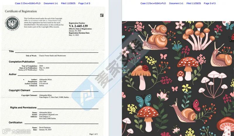 本案依旧是keith律所联合ference律所在宾夕法尼亚州发起的版权维权案件,原告是塞尔维亚设计师Aleksandra Misic针对未经授权使用其森林与蜗牛插画图案的行为发起的维权行动,本次涉案版权号为:VA 2-445-139,于2025年1月30日获得美国版权认证。值得注意的是,Aleksandra Misic在同一天一共下证了14个版权作品,跨境卖家均需留意,避免后续连环维权案件中被TRO冻结的风险!