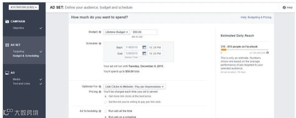 在Facebook广告管理工具中,完成广告目标设定后,可进入定位、预算与排期设置页面[k]。
