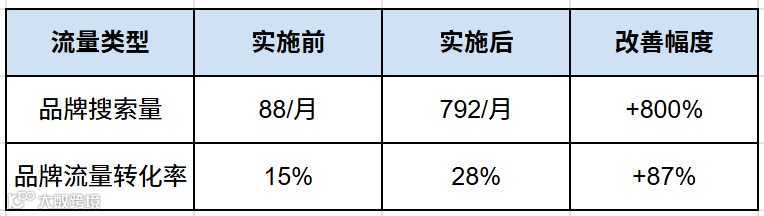 - 结果:品牌词搜索量增长8倍,搜品牌词进来的客户转化率是普通流量的2倍,且几乎没有直接竞争对手。