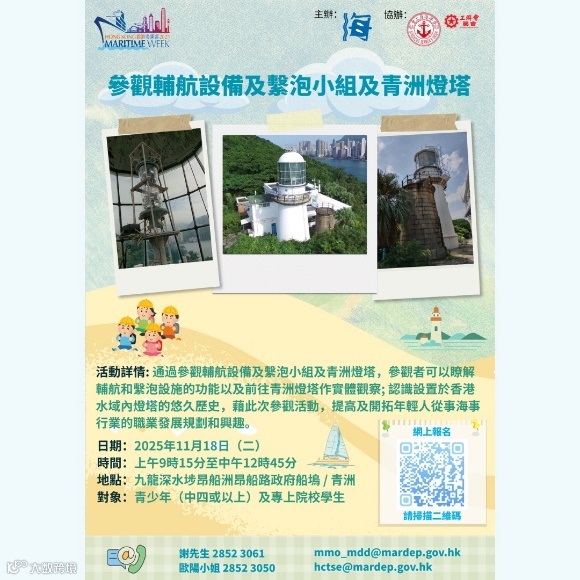 海事处将于11月18日上午安排参观辅航设备及系泡小组及青洲灯塔之旅。参观者可以了解辅航和系泡设施的功能,以及前往青洲灯塔作实体观察,认识设置于香港水域内灯塔的悠久历史。