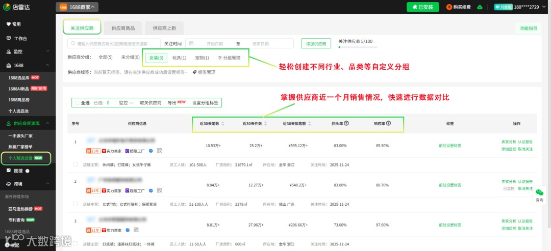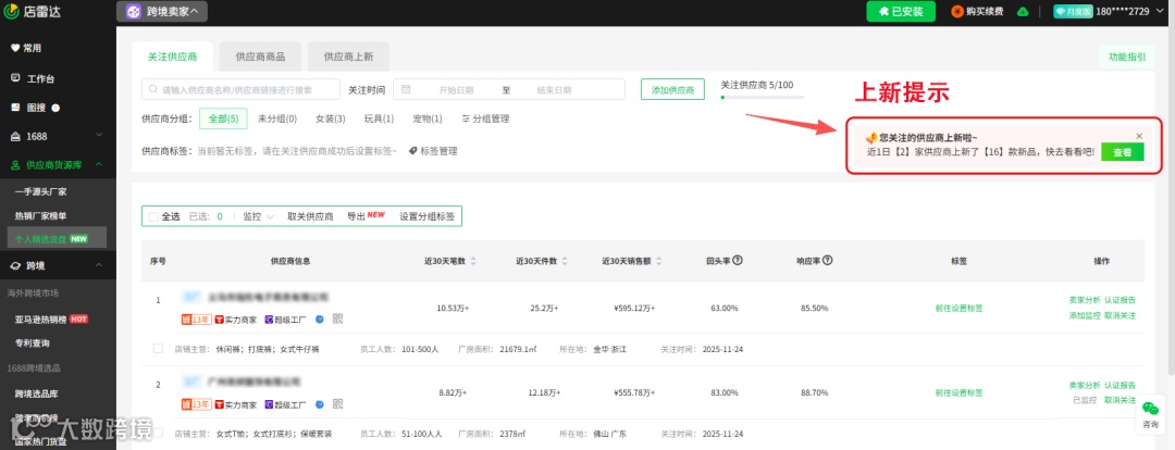 在店雷达官网侧面导航栏找到个人精选货盘,进入【关注供应商】,根据自身的需求对供应商进行精细化分组与标签化运营,例如按照行业划分女装、玩具、宠物等,当需要补货时,只需进入工作台,打开目标分组,就能快速找到合作工厂,提高效率。