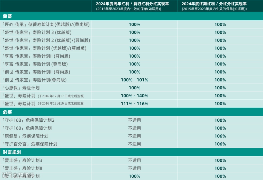 友邦保险多款产品如「充裕未来·盈尚」复归红利达162%,「充裕未来2」连续7年保持100%或以上;安盛「安进储蓄系列2-跃进」比率达100%-107%;周大福人寿三大皇牌产品系列(储蓄、危疾、财富规划)全线达到100%或以上,连续9年实现大满贯;富卫「寰悦致富」周年红利实现率高达171%-190%。