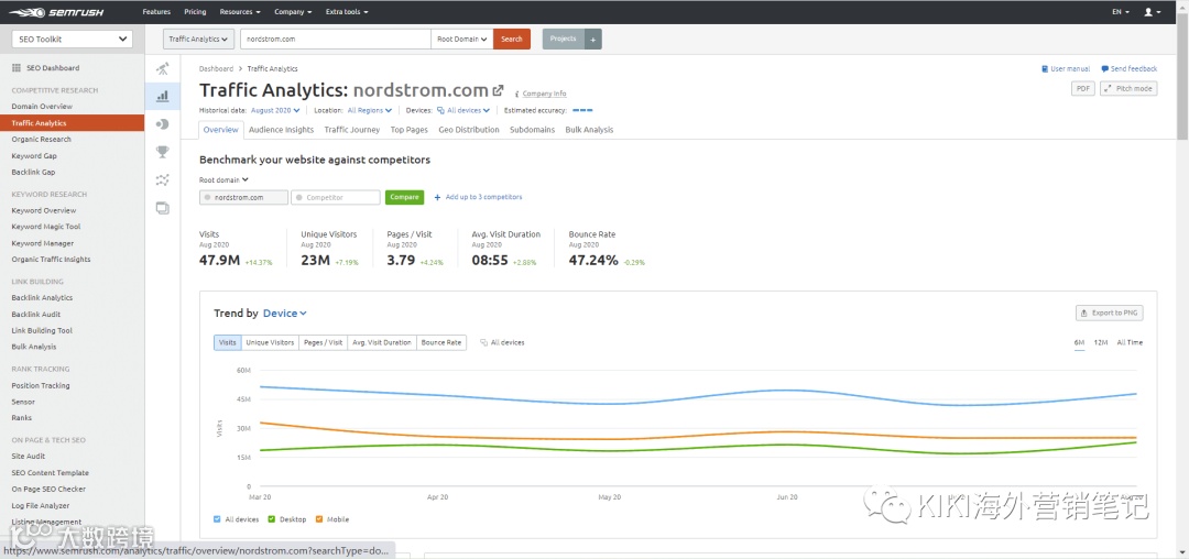 将目标网站输入SEMrush后,可获取大量关键数据,涵盖关键词表现、流量构成与自然流量价值等维度[k]。