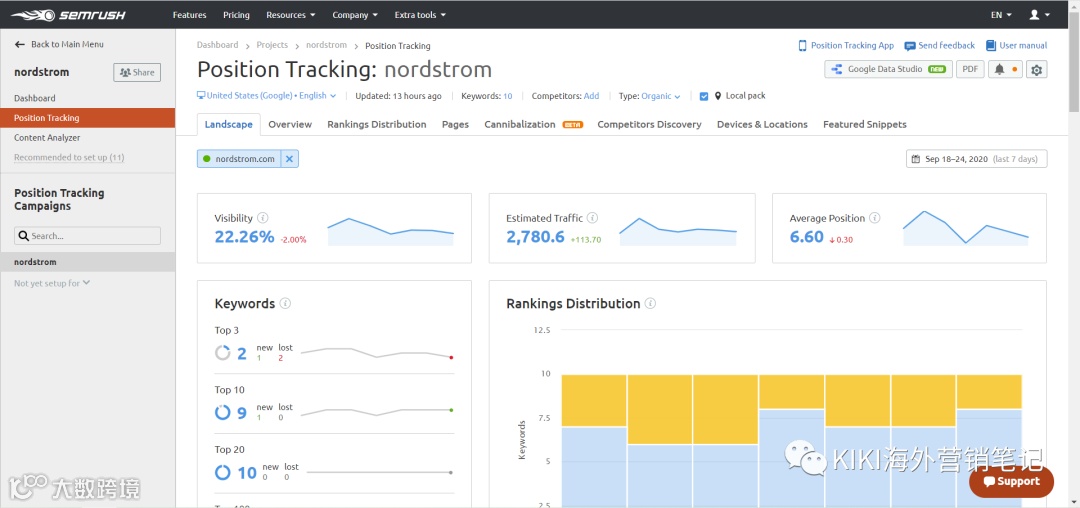 Organic Research(自然搜索研究):查看竞品网站在谷歌中的关键词排名、自然流量表现、SERP特色结果(Featured Snippets)覆盖情况,并识别其近期排名变化趋势[k]。