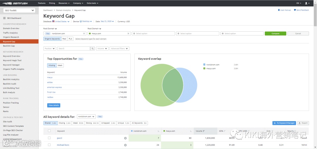 Keyword Gap(关键词差异分析):对比自身与竞争对手在自然搜索、付费广告及谷歌购物(PLA)关键词上的覆盖差异,挖掘潜在机会词[k]。