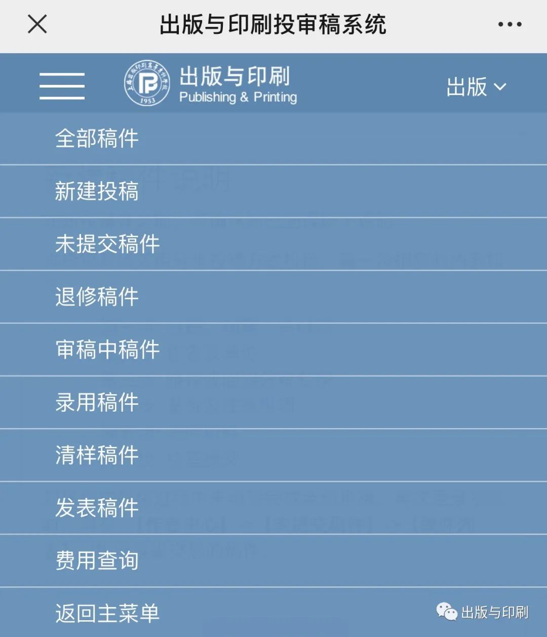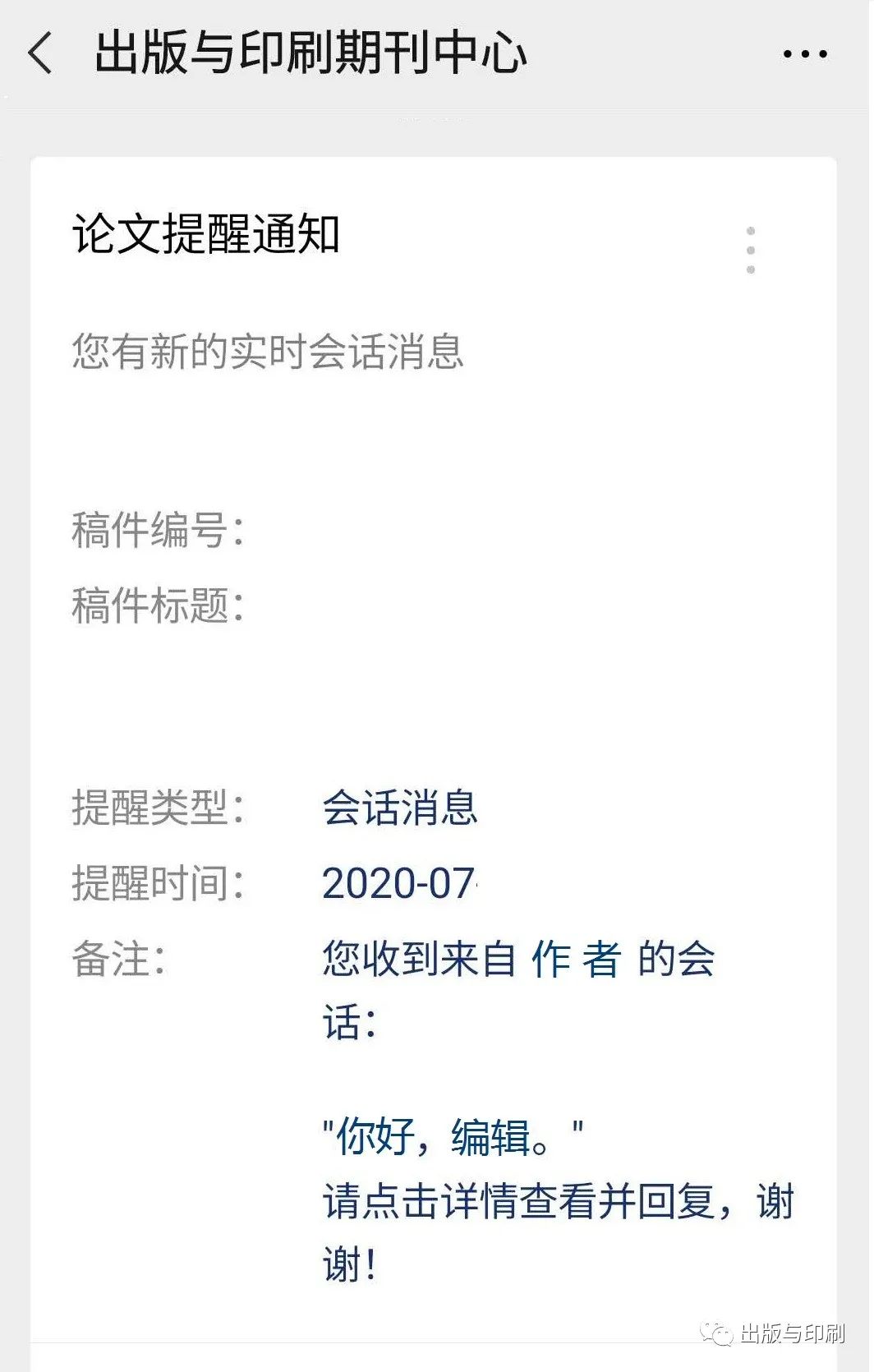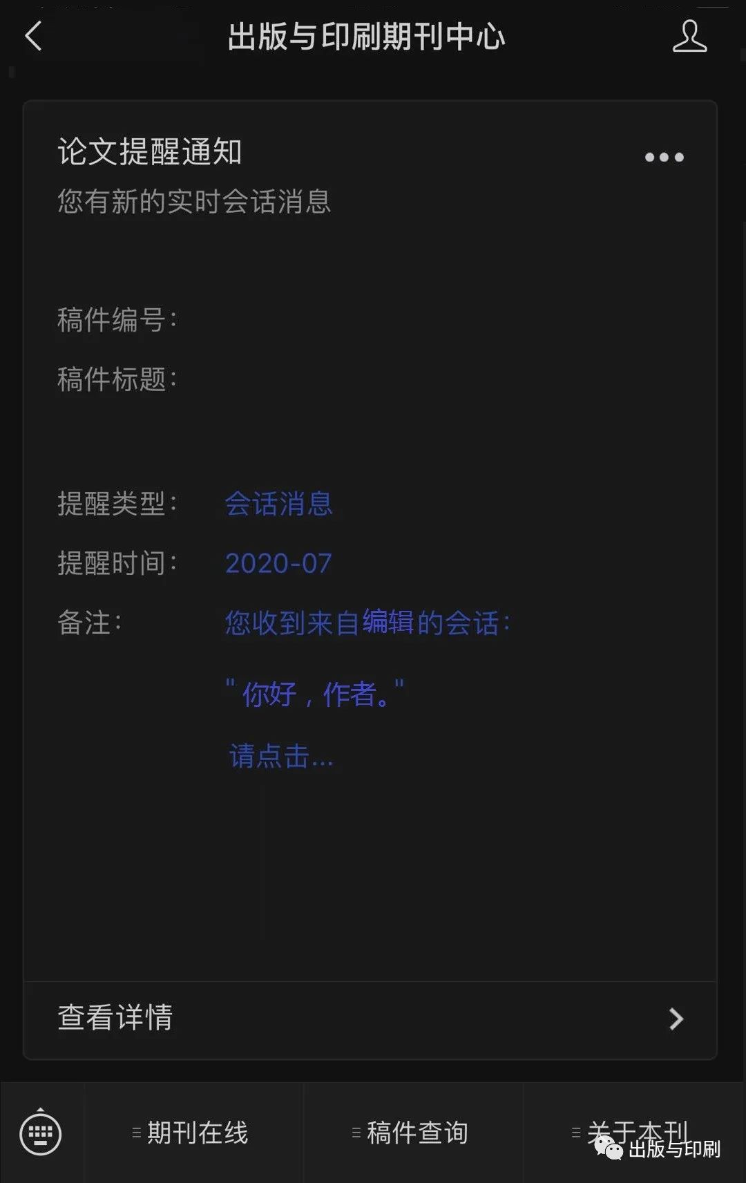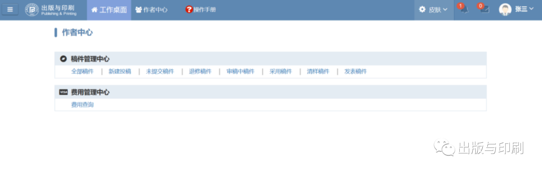 进入投审稿系统后,通过专属二维码关注“出版与印刷期刊中心”。该服务号与投审稿系统绑定,作者可进行手机投稿、查稿等操作,并即时查收系统的通知与编辑的审稿意见。