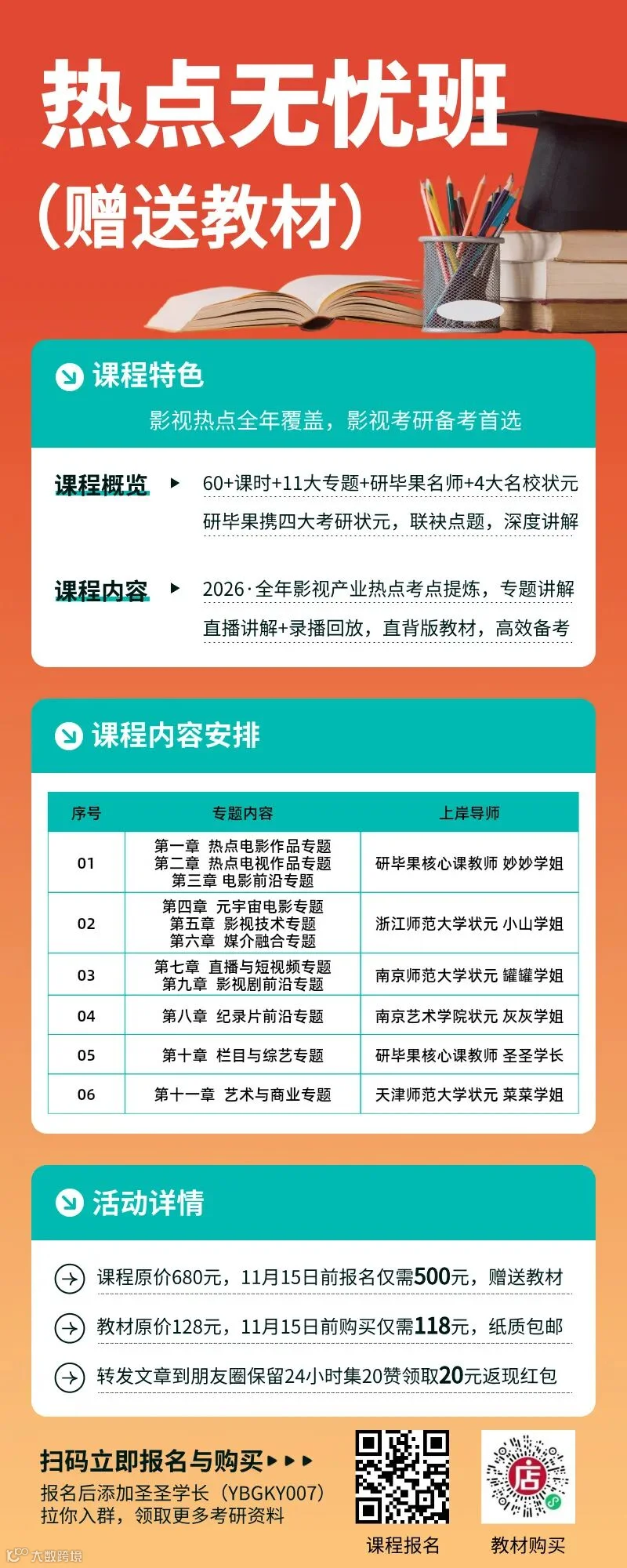 影视学术前沿,热点研究为帆。研毕果教育深耕考研领域多年,推出「热点无忧班(2026版)」。课程深入分析全国各院校历年真题高频考点,模块化整合构建知识框架,直击核心命题方向。我们不仅提供资料,更提炼“知识精华”,助力考生高效备考。