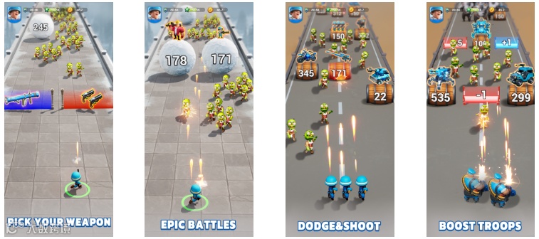 《Last War:Survival》整体的画面角色设计思路来源于他们大名鼎鼎的另一款产品《口袋奇兵》(Top War),而后者爆火的策略与此前凭“网红狗头”在海外爆火的冰川网络的《X-Hero》一致,即“副玩法买量”,特别是在短视频应用内,相信大部分人都曾刷到过以蓝色小兵为主角“智取”其他颜色敌军的广告画面。《Last War:Survival》的成功也离不开元趣对这般成熟营销策略的运用上。