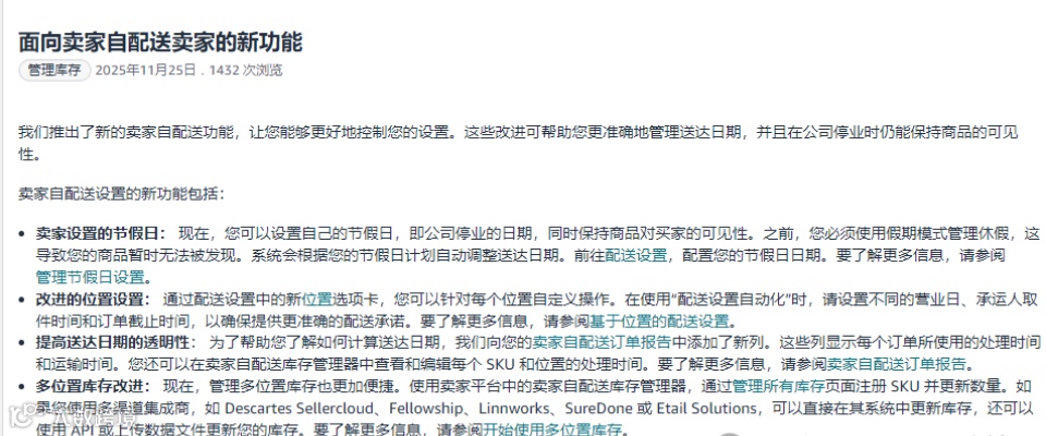 亚马逊近日针对卖家FBM推出了一些新功能,想要提升卖家对发货流程的控制能力和多点库存管理效率。具体包括“卖家自定义假期”、“多地点配送管理”等实用功能,为FBM卖家带来了更灵活的运营空间。我们一起来看下吧!
