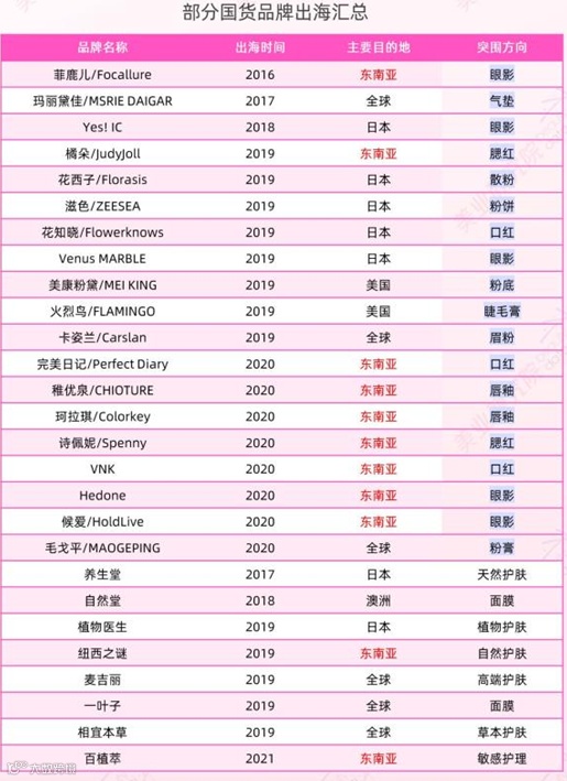 从出口国货美妆品牌类型来看,有以玛丽黛佳等依靠代工厂出海的老牌美妆品牌,还有以花西子、花知晓、完美日记等营销为主的新锐美妆品牌。