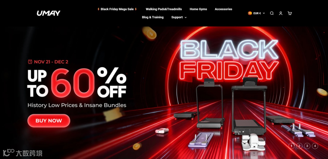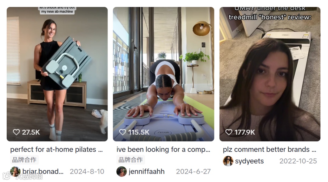 2024年TikTok Shop开放独立站后,Umay抓住机会,凭借一条生活化爆款视频打开市场:视频中女博主使用Umay走步机锻炼,镜头意外捕捉到小猫将履带当猫抓板的趣味画面,迅速引发用户共鸣,带动单周销量达100–200单/天,一年累计售出5万件。