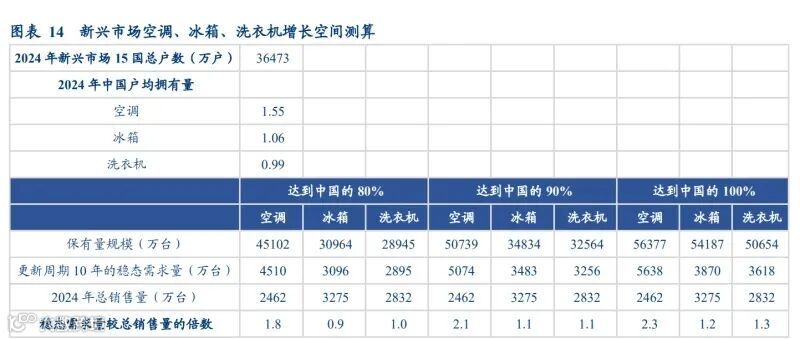 普及率对比显示,上述地区空调、冰箱、洗衣机、电视普及率普遍低于中国,呈现“电视>冰箱>洗衣机>空调”梯度,空调扩容潜力最大。基于户均保有量模型测算:若新兴市场15国大家电保有量达中国2024年水平的80%/90%/100%,则空调稳态年需求为2024年销量的1.8/2.1/2.3倍,冰箱为0.9/1.1/1.2倍,洗衣机为1.0/1.1/1.3倍,仅保有量提升即可支撑广阔增长空间[2]。