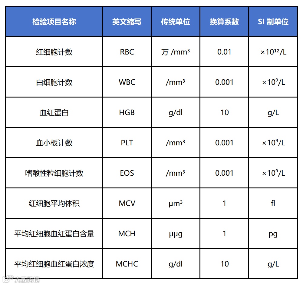 血常规项目的单位主要围绕细胞数量和血红蛋白浓度设计,涉及传统单位与国际制单位的对应转换。