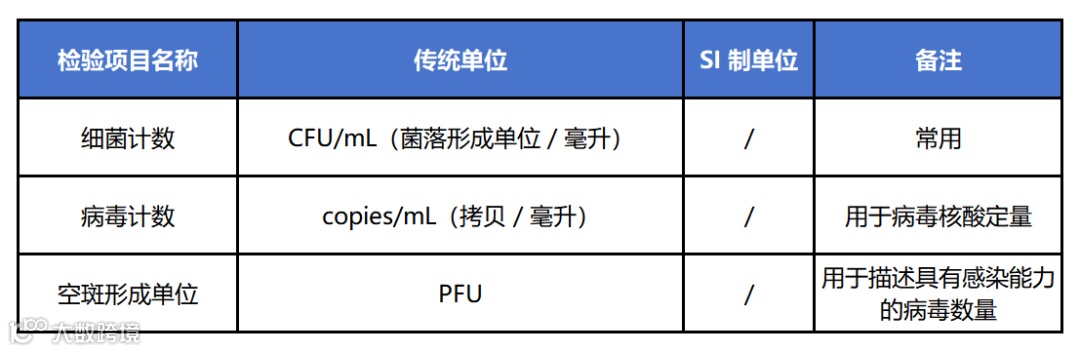 微生物检测的单位聚焦于微生物数量、感染活性及浊度评估,反映样本中微生物的存活状态与浓度。