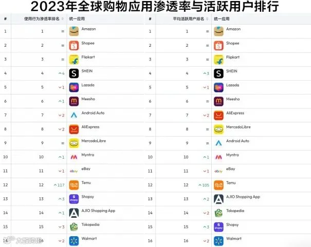 Data.ai数据显示,SHEIN活跃用户持续上升,在2023年全球购物类APP活跃用户排名中,亚马逊仍居榜首,而SHEIN上升三名位列第四,Lazada和Aliexpress、Temu分别位第五、第七位和第十二位;在2023年全球购物类APP行为渗透率排名中,SHEIN上升四位名列第四,Lazada和Aliexpress、Temu分别位第五和第八位、第十二位。