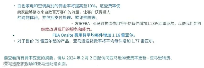 亚马逊巴西站在近日发布通知称,亚马逊巴西的佣金率、亚马逊物流(FBA)、FBA Onsite和Amazon Delivery的更新将于2024年2月2日生效。