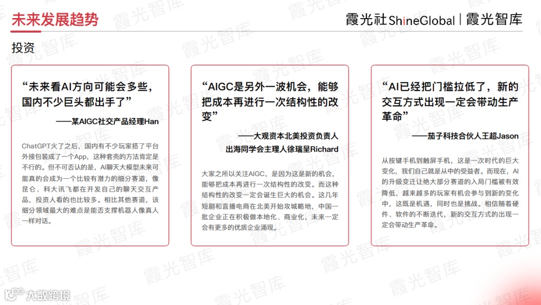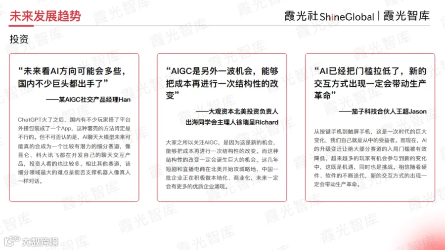 关于接下来的市场机会,大观资本北美投资负责人、出海同学会主理人徐瑞呈Richard分享了他观察到的出海新趋势。从去年开始,他明显感觉到AIGC技术领域的狂飙突进。“大家都在关注AIGC,是因为这是新的机会,能够把成本再进行一次结构性的改变,而这种结构性的改变一定会诞生巨大的机会。”