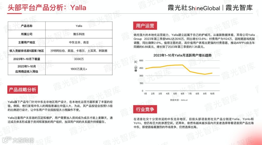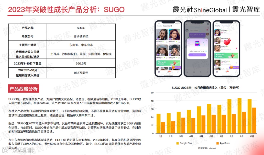 SUGO是一款陪伴交友产品,为用户提供交友匹配、语音房、视频通话等功能。2023上半年,SUGO收入同比增长超5倍。根据data.ai,该产品2023年多次进入“中国非游戏应用出海收入榜”Top30。在社交产品出海日益激烈的竞争现状下,SUGO依然成功突围,主要得益于其灵活的运营策略,选择将主攻市场定位在热爱线上社交,特别是语音、视频聊天的中东市场。