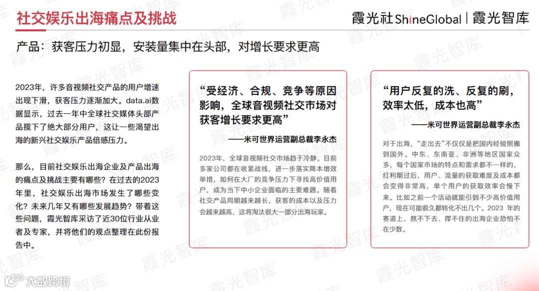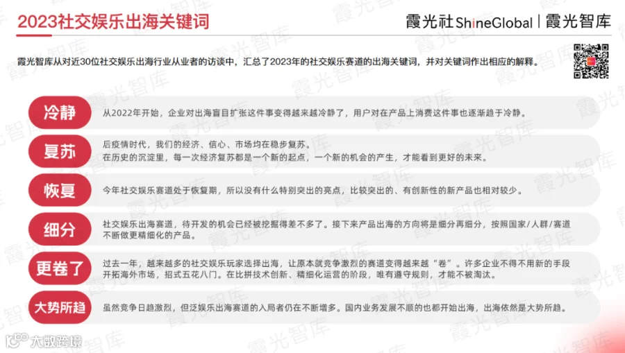那么,在过去的2023年里,社交娱乐出海市场发生了哪些变化?未来几年又将有哪些发展趋势?带着这些问题,霞光智库对近30位行业从业者及专家进行了访谈,将他们的观点整理到《2024年社交娱乐出海发展趋势洞察报告》中。