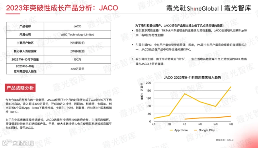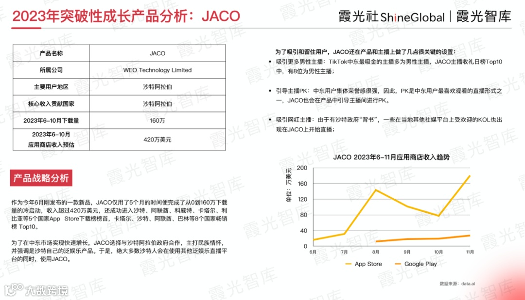 作为2023年6月刚发布的一款新品,JACO仅用了5个月的时间,便完成了从0到160万下载量的冷启动,收入超过420万美元,还成功进入沙特、阿联酋、科威特、卡塔尔、利比亚等5个国家App Store下载榜榜首,以及卡塔尔、沙特、阿联酋、巴林等8个国家畅销榜Top10。