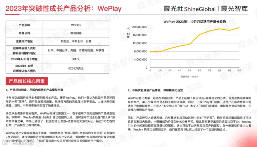今年,社交出海行业从业者提到最多的产品,便是WePlay。业内一致认为,这款产品是近两年的一匹“黑马”。该产品在游戏质量、玩法等方面的完成度均高于竞品。上线以来,其在东南亚、日韩、中东等市场均实现了快速增长。