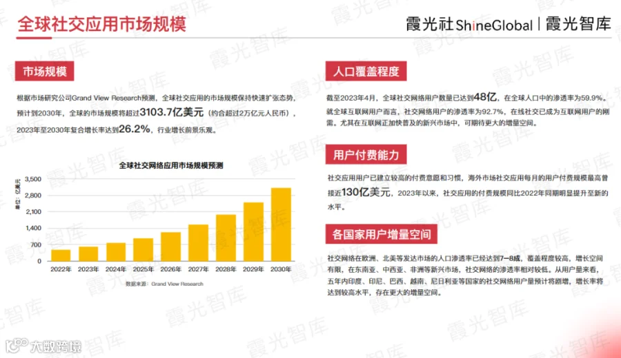 如今,伴随着国内用户增长进入瓶颈等诸多因素,“出海”已成为各行各业的最大确定性,社交这门实在的生意亦是如此。市场研究公司Grand View Research预测,全球社交娱乐应用的市场规模保持快速扩张态势,2023年至2030年复合增长率达26.2%。