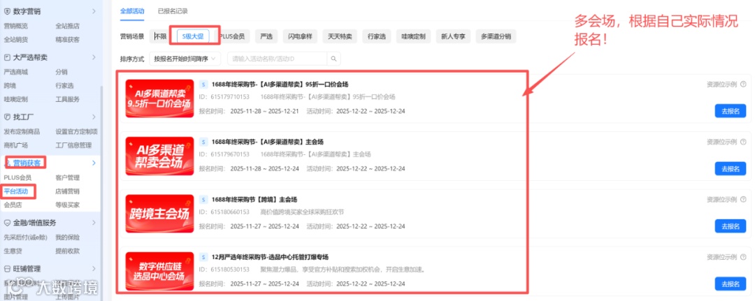 - 登录1688后台 → 营销获客 → 平台活动 → S级大促,选择对应会场进行报名。