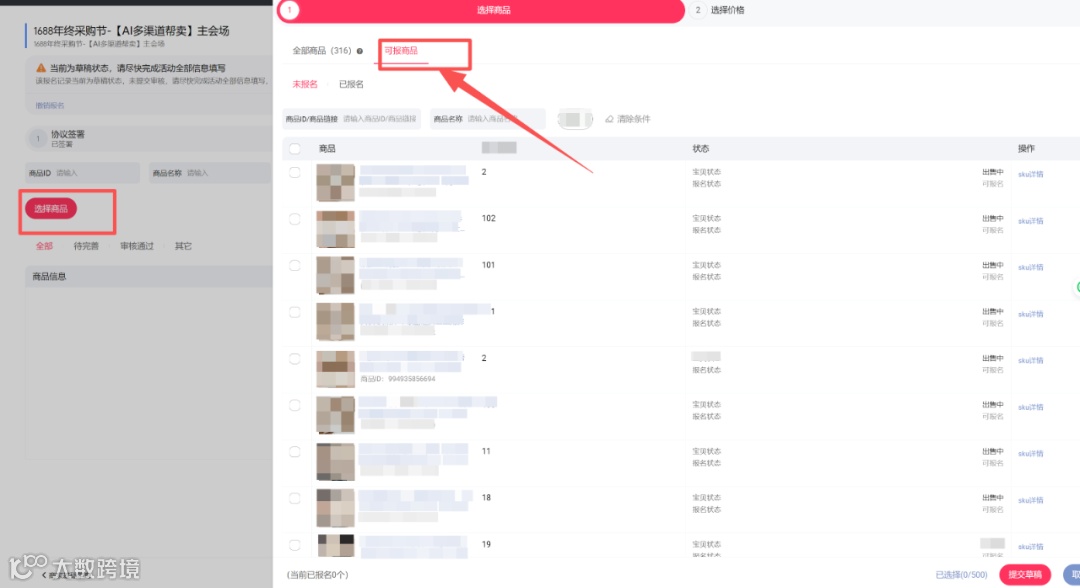 - 进入商品提交环节,根据会场要求及店铺定位选择报名商品。