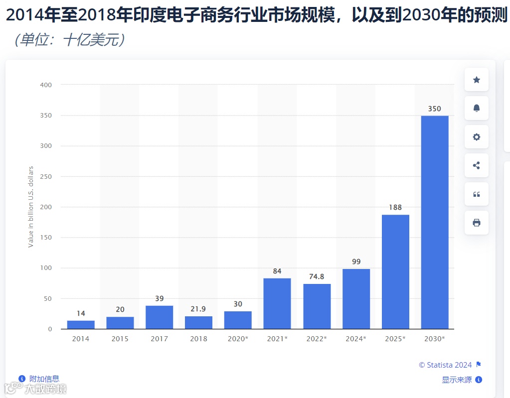 根据Statista数据显示,2018年印度电子商务市场规模约220亿美元,预计2030年将达3500亿美元。