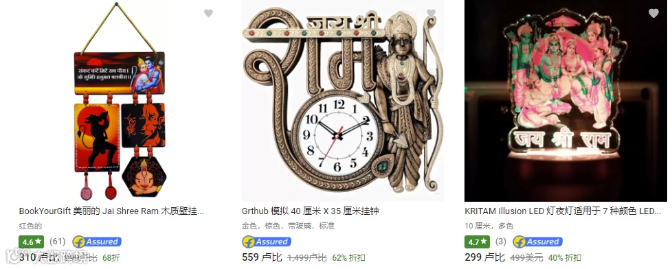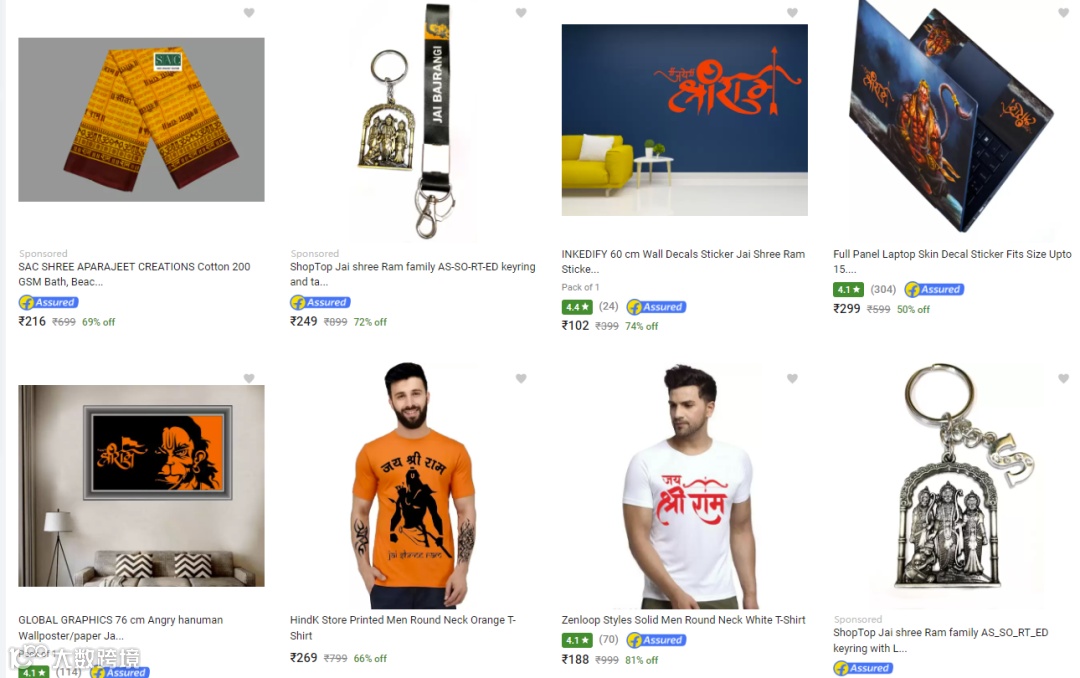 印有“Jai Shree Ram”字样、“哈努曼”图像的T恤、围巾、钥匙圈、壁纸贴画在Flipkart上持续热销。