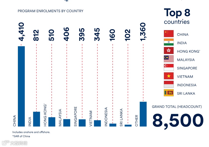 学校吸引了来自90多个国家的27000多名学生。其中在校国际生中,中国学生最多,超过4000名。