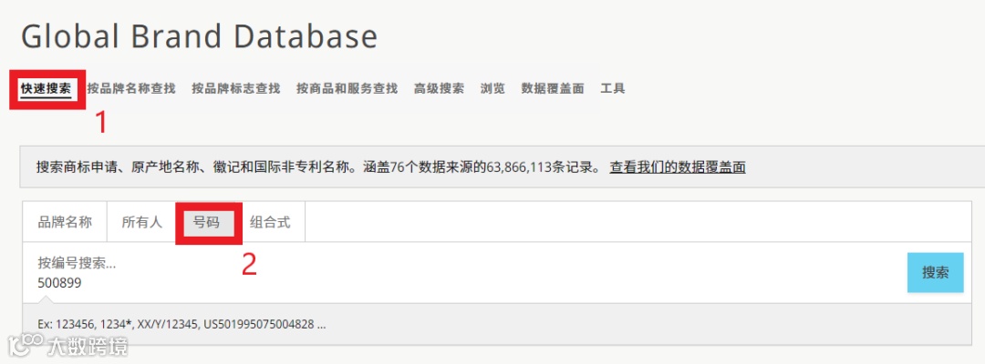 快速搜索涵盖申请号、注册号等多种类型号码,可能返回多个结果。建议使用结果页左侧的筛选器进一步缩小范围,以定位目标商标[k]。