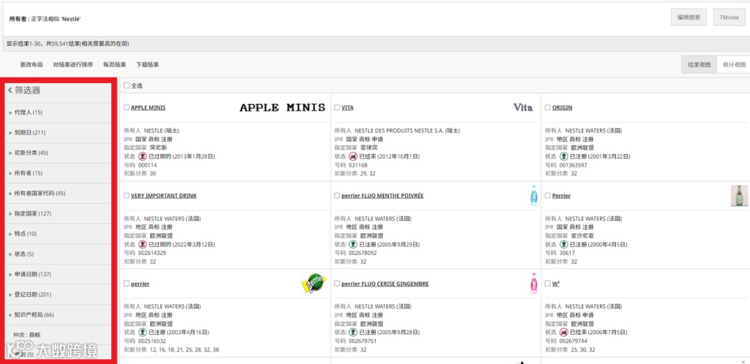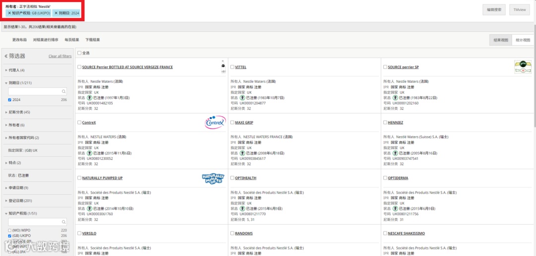 以雀巢公司为例,在“快速搜索”-“所有人”中输入“Nestlé”,系统将返回其名下所有商标。随后利用左侧筛选器,可进一步限定至某一国家或地区知识产权局,并可筛选如“2024年到期”的商标,实现多条件交叉检索[k]。