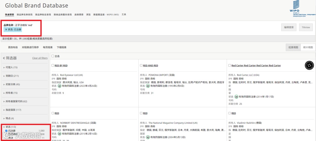选择马德里体系数据集后,结合状态筛选功能,可精确查找具有特定法律状态的国际商标[k]。
