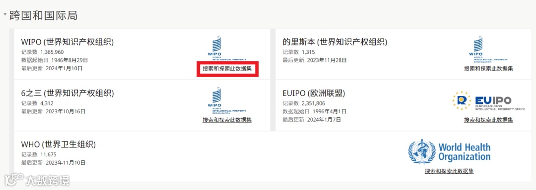 全球品牌数据库首页的“数据覆盖面”模块不仅展示当前收录的数据集,还支持在特定数据集中进行商标查询[k]。