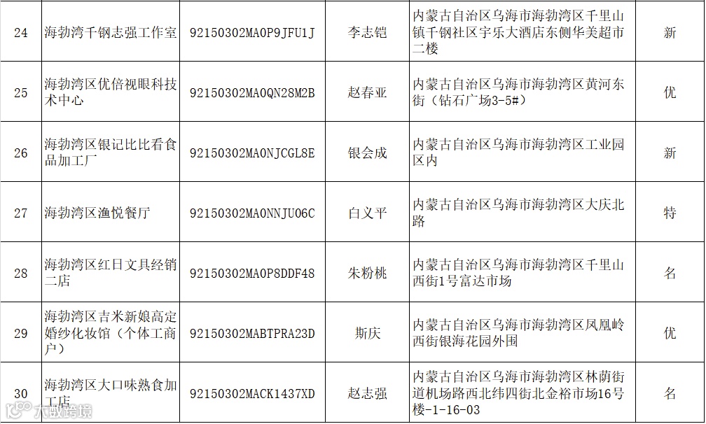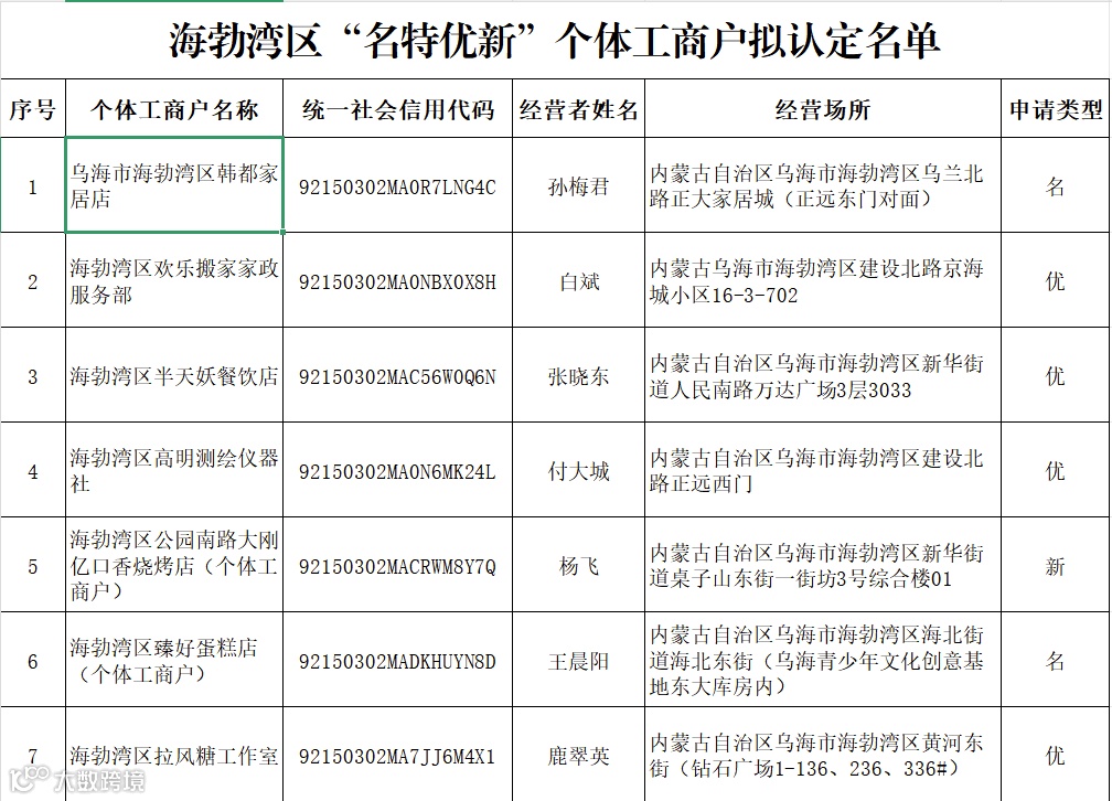 海勃湾区“名特优新”个体工商户拟认定名单公示